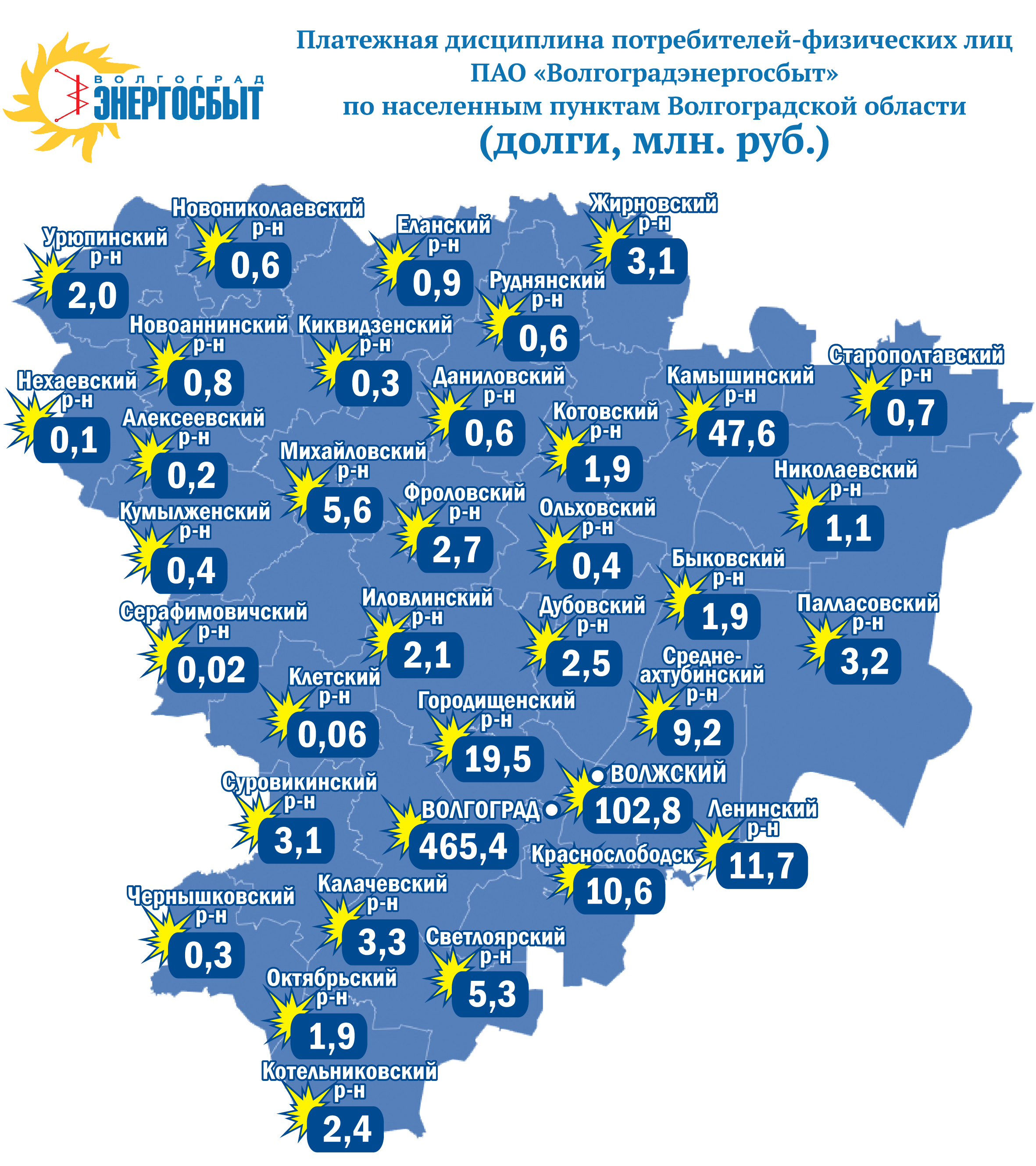 Просроченная задолженность жителей Волгоградской области по оплате электроэнергии на 1 декабря 2022 года составила в общей сложности более 716 миллионов рублей. Самые большие суммы – у жителей Волгограда, Волжского, Камышина и других городов области. Не только потому, что в городах расход электроэнергии больше, но и потому что там проживает большая часть населения. Однако в лидерах антирейтинга также далеко не самые многочисленные Городищенский, Ленинский районы и город Краснослободск.