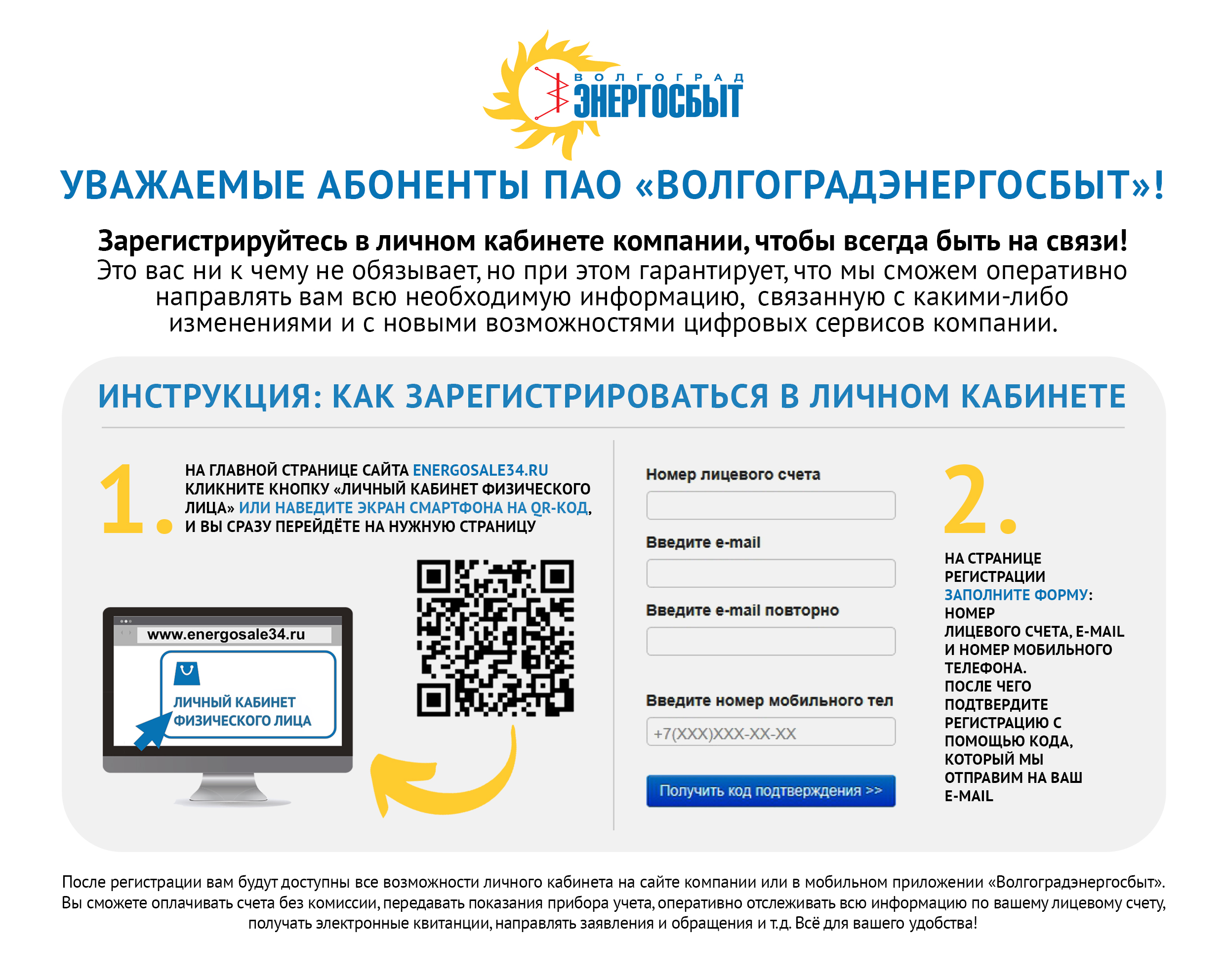 Одна из проблем, говорят специалисты ПАО «Волгоградэнергосбыт», состоит в том, что для владельца квартиры, в которой он не проживает, квитанция не является надежным способом связи с энергоснабжающей компанией. Счета могут потеряться, пропасть из незапертого ящика, забирают их владельцы жилья также нерегулярно. Между тем несвоевременная передача показаний при несвоевременной оплате грозит начислением значительной суммы задолженности. Зарегистрировавшись в личном кабинете на сайте компании и установив мобильное приложение на смартфон, Вы сможете оперативно получать информацию о состоянии лицевых счетов, уведомления о задолженности, отслеживать историю начислений и платежей, оплачивать квитанции и т.д. Даже из другого города и другой страны, причем в любое время.