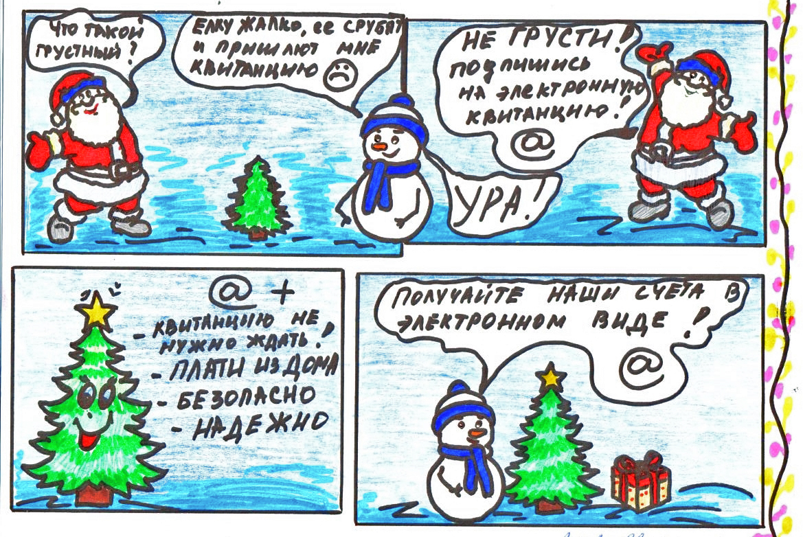 7-летняя Евангелина изобразила грустного снеговика, жалеющего ёлочку – ведь дерево должны срубить, чтобы из бумаги изготовить квитанцию. Но по развитию сюжета в дело вмешался Дед Мороз и посоветовал подписаться на онлайн-документ: квитанцию не нужно ждать в почтовый ящик, она не потеряется, безопасно и надежно оплатить её можно прямо из дома и самое главное – ёлка останется целой!