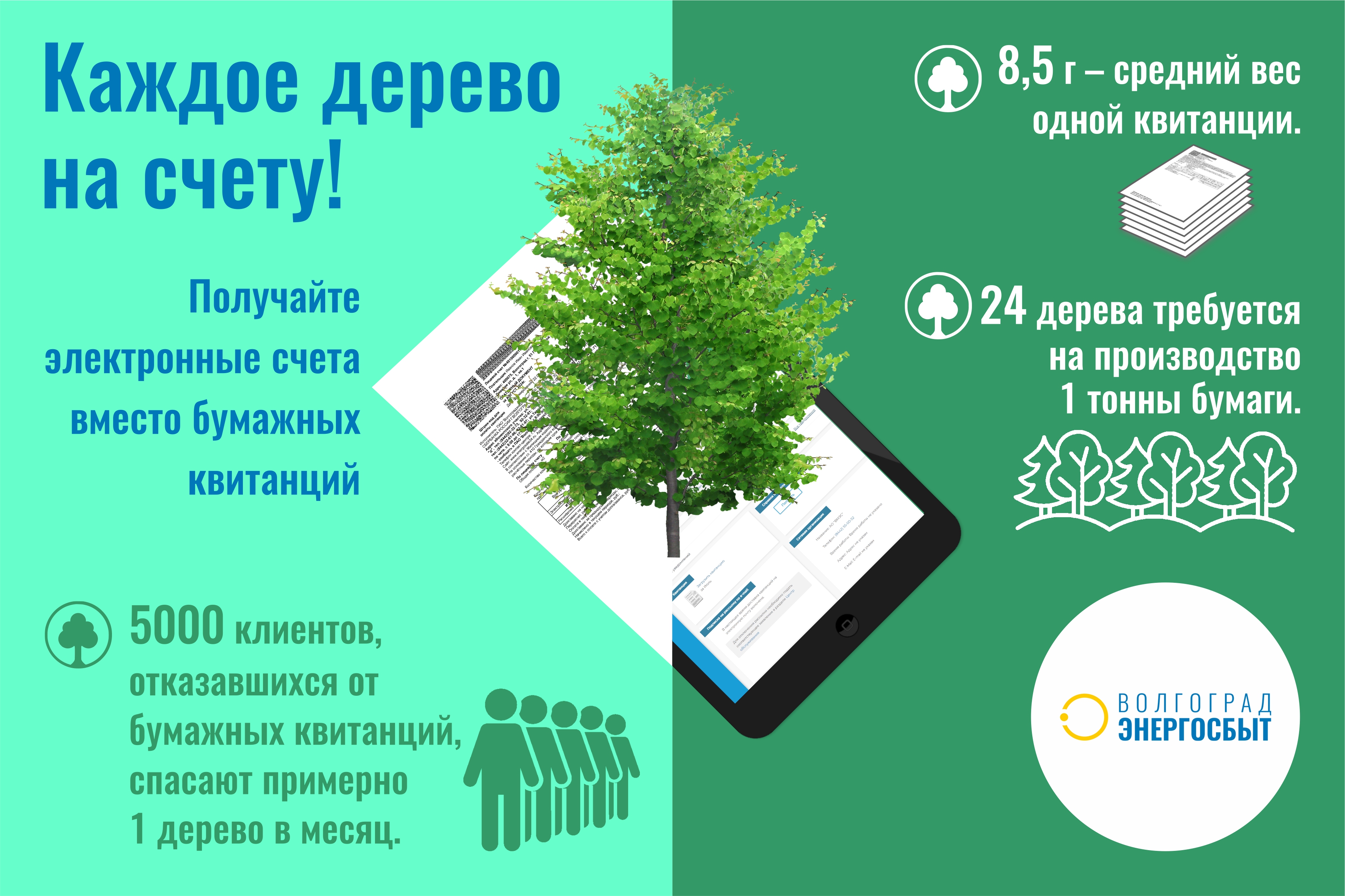 Почти 190 тысяч клиентов «Волгогоградэнергосбыта» получают квитанции по оплате в электронном виде. Одна бумажная квитанция весит в среднем 8,5 граммов, а на производство одной тонны бумаги требуется 24 дерева. С учетом того, что отказ от печати 5 тысяч бумажных счетов сохраняет от вырубки одно дерево, с января по август получателям счета по e-mail удалось спасти 304 дерева.